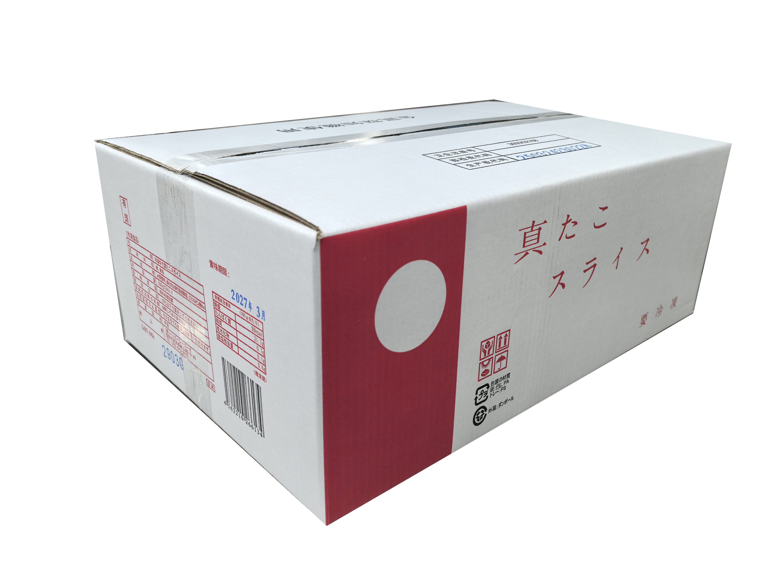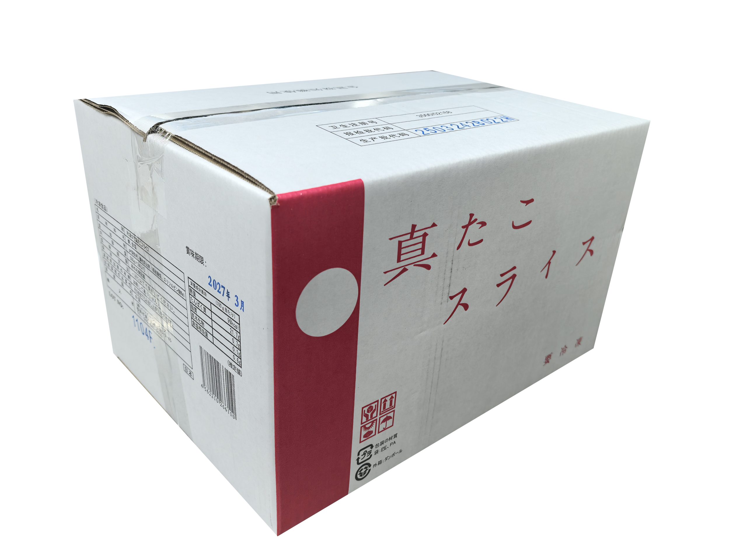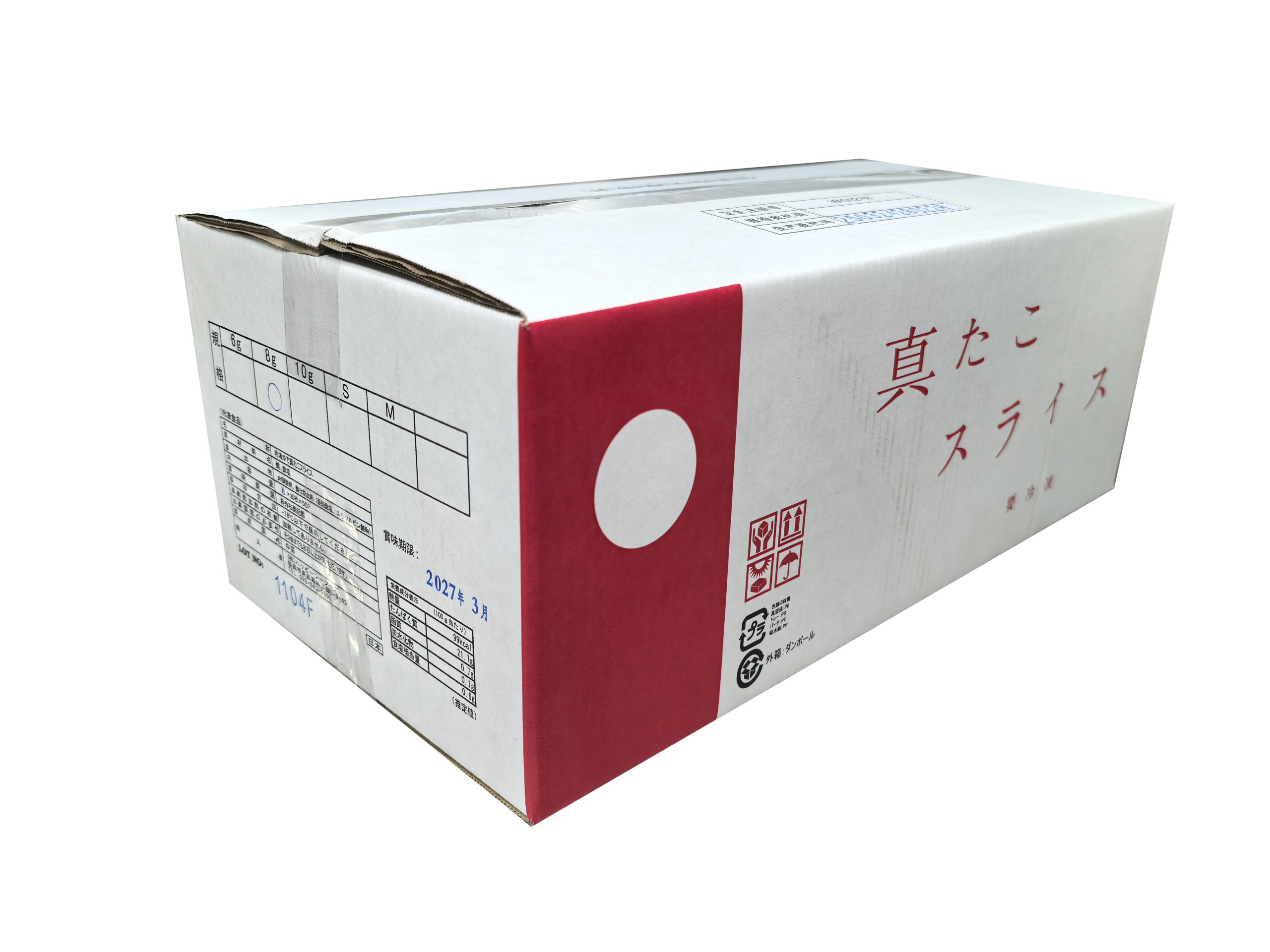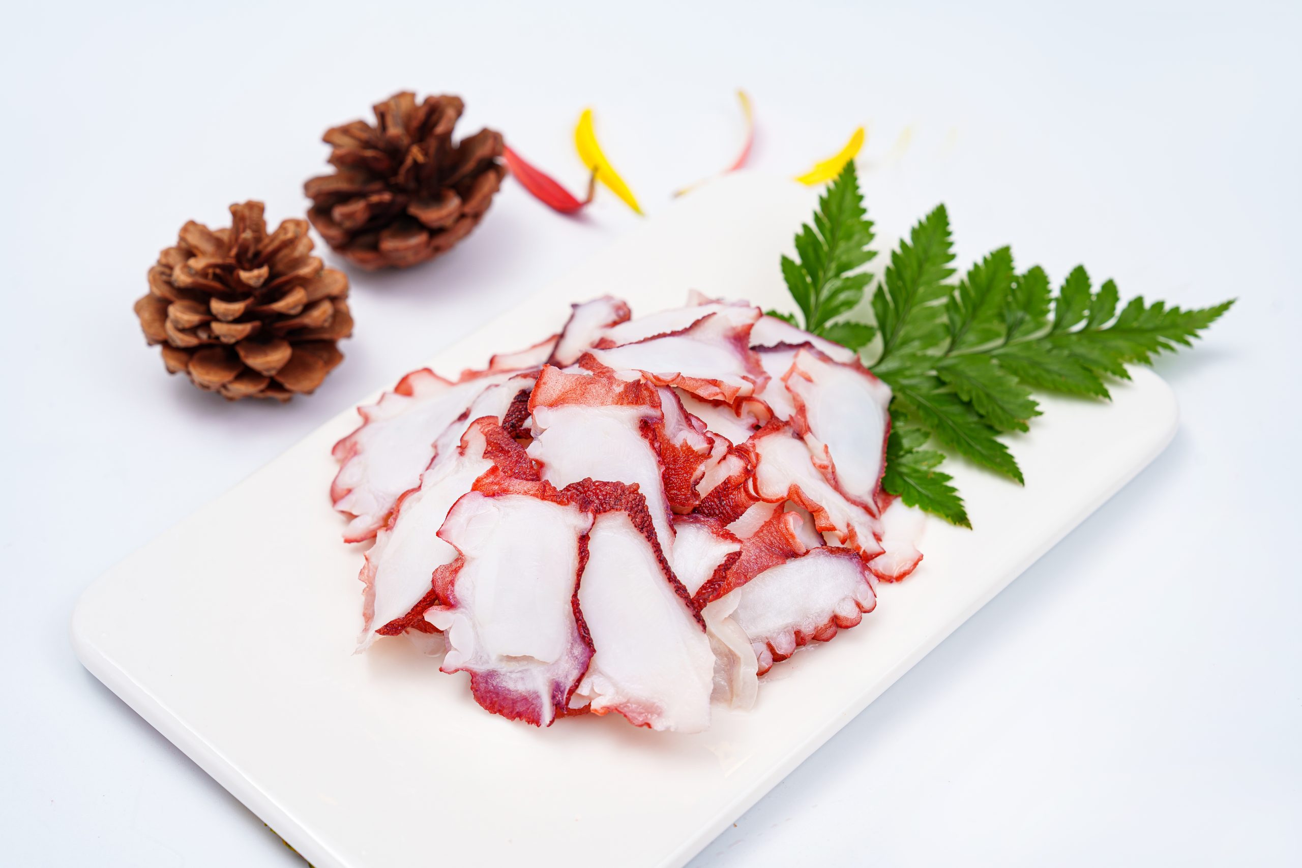 寿司ネタに最適な生食用の真蛸スライス。スライス幅が大きく見えるように蛸足の根元部分をスライスしております。